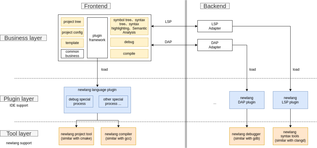 如上圖所示,帶顏色的模塊均和特定的語言相關,對應通信中間件用的是 LSP(Language Server Protocol) 語言服務協(xié)議,可以基于該協(xié)議實現(xiàn)語法高亮、符號樹、語法樹等功能;調(diào)試相關的用的是 DAP(Debug Adapter Protocol) 調(diào)試適配協(xié)議,可以基于該協(xié)議實現(xiàn)被調(diào)試程序的啟動、運行、斷點命中、單步跳入、單步跳出等常用調(diào)試功能。